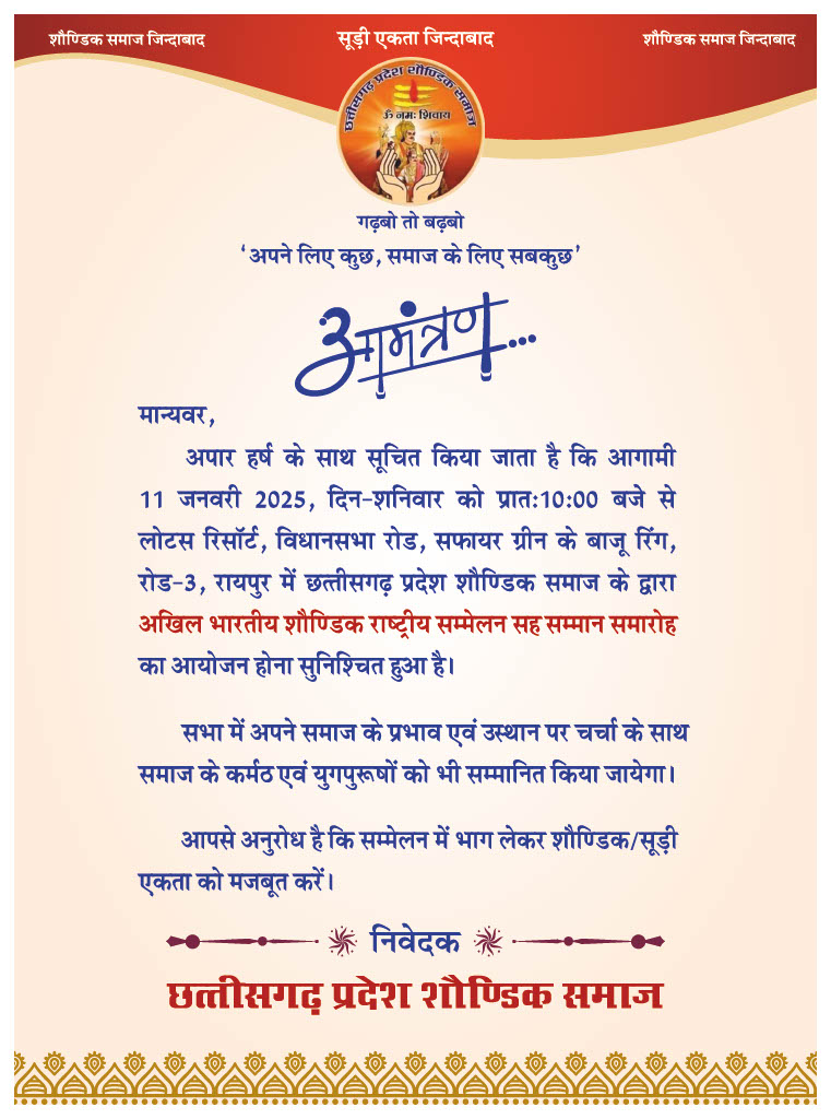शौण्डिक समाज की जड़ें काफी गहरी है और यह बरगद रूपी वृक्ष शौण्डिक समाज के हर वर्ग को ठंडकता का अहसास अपने समाजिक सेवा के माध्यम से प्रदान करता आ रहा है। छत्तीसगढ़ प्रदेश शौण्डिक समाज की कल्पना का रोपण इसी उद्देश्य की परिणीति है जिसकी स्थापना 25/02/2024 को प्रमुख महानुभवों सर्व श्री श्याम किशोर गुप्ता, श्री ओमप्रकाश गुप्ता, श्री शिवरतन प्रसाद गुप्ता, श्री सुरेश प्रसाद गुप्ता, श्री नंदकिशोर गुप्ता के कल्पना के अनुरूप संस्थापक बने।